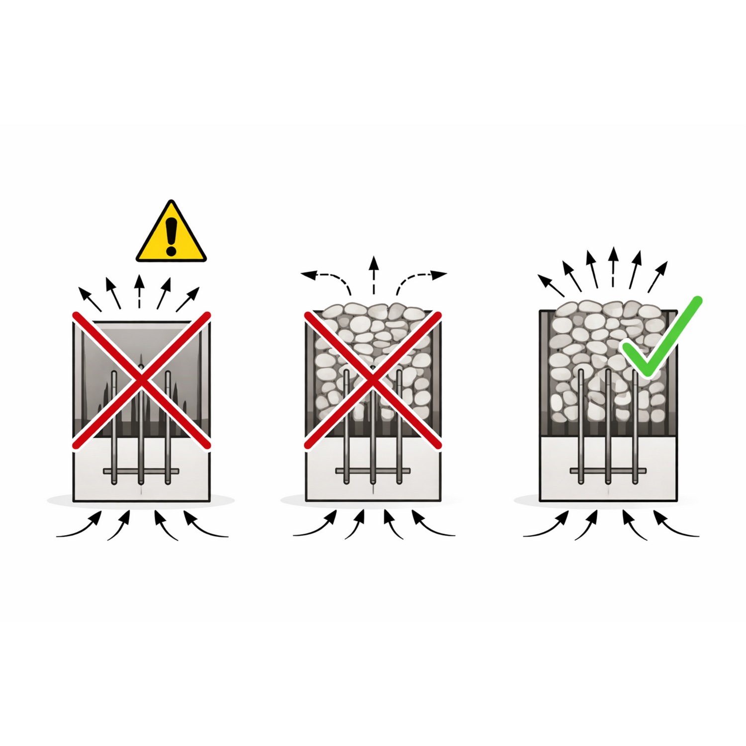 When adding sauna stones, do not pack the stove full. Overfilling can force the heating elements together, which may lead to a short circuit and damage the heater.